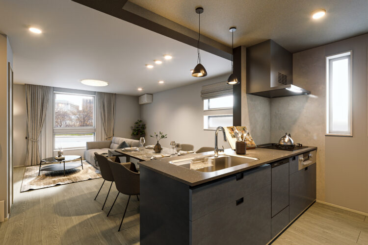 両サイドのT-1(ダークモダン)とT-3(グレイッシュモダン)は、「効率」と「癒やし」のメリハリを大切にした住まいです。