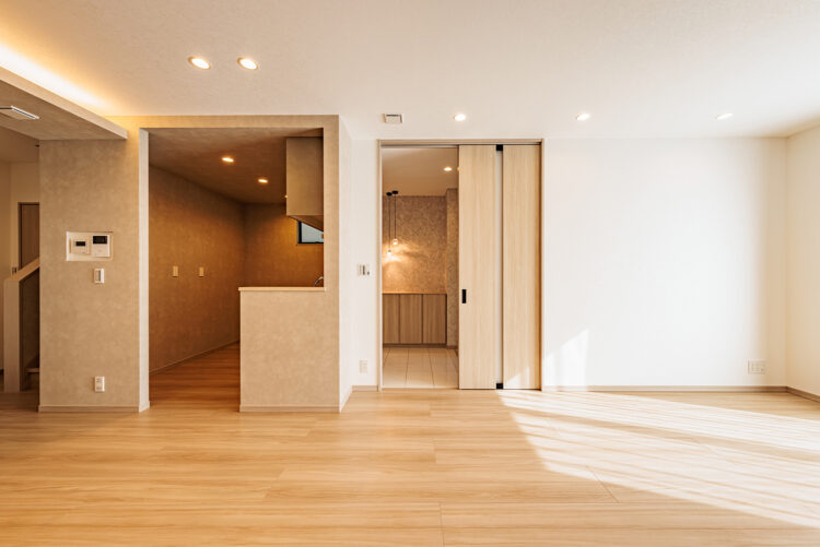 生活感を隠す: キッチンをリビングから見えにくい位置に配置。洗い物や調理家電が視界に入らないため、食後のリラックスタイムがしっとりとしたものになります。
