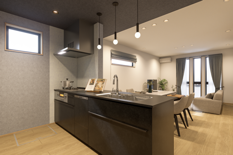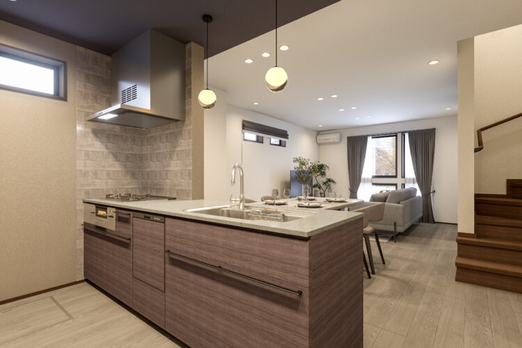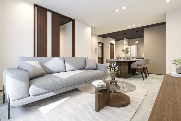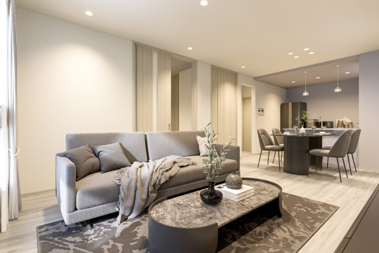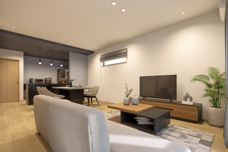 3棟の中で最も広い、19.0帖のLDKを実現しました。 内装は、グレージュの床材にダークブラウンの建具を合わせた、洗練されたモダンコーディネート。