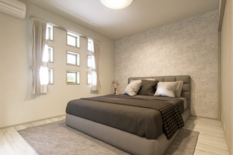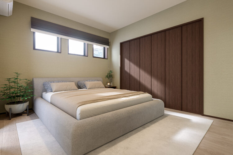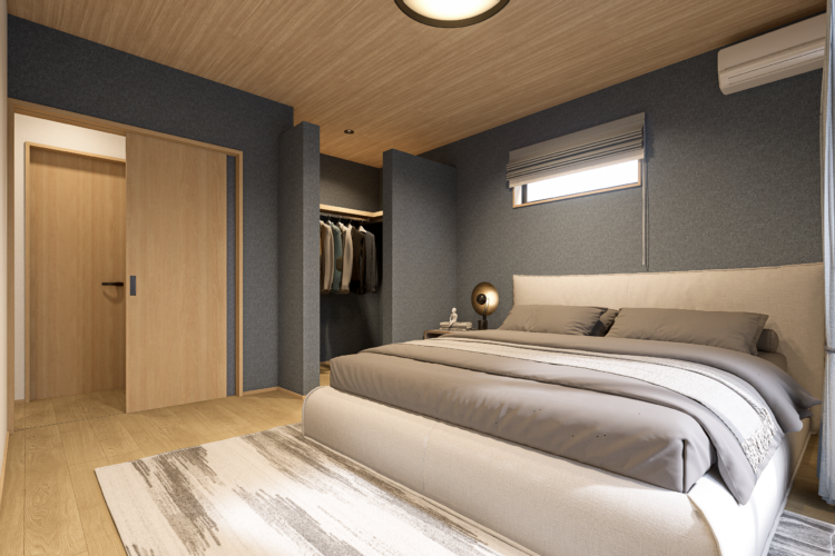 天井には木目調のクロス、壁面にはダークグレーのアクセントを採用し、まるでホテルのスイートルームのような深みのある空間に仕上げました。 大きめのベッドを並べても余裕があり、ドレッサーや書斎デスクを置いて「自分だけの場所」を作ることも可能。一日の終わりを心ゆくまでリラックスして過ごしたい方に、ぜひおすすめしたい一棟です。