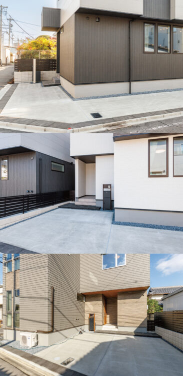 濃淡のコントラストを際立たせた外観のプロポーションや、グレージュを基調に上品な雰囲気にまとめた外観など、スタイリッシュなデザインの3棟のお家が落ち着いた街並みに彩りをもたらしています。