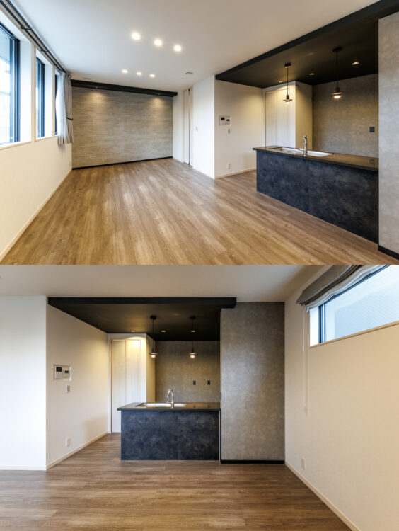 名古屋市内に4LDK・駐車スペース2台を確保し、個性的な外観デザインが際立つ北区の3棟のお家。今回はダイニング・リビングとキッチンのゾーニングの工夫など、室内の設計デザインの魅力をご紹介します。