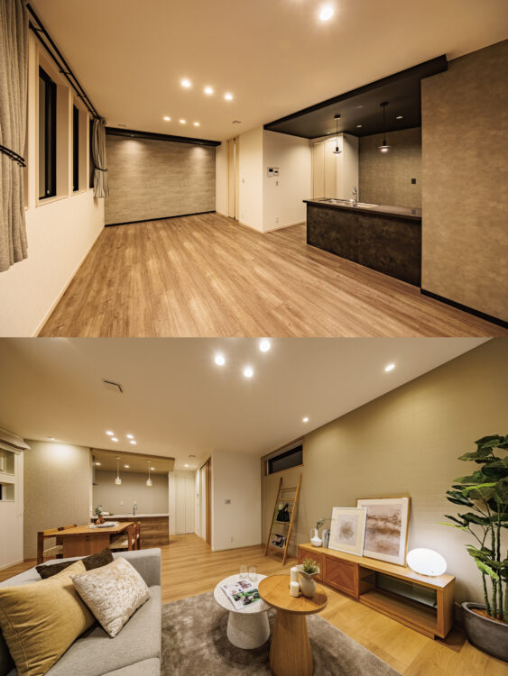 2棟のお家では天井に埋め込まれたダウンライト照明をLDKに採用。天井がフラットになり、LDK全体に広がりを感じさせてくれます。ダウンライトの位置によって空間の印象が左右されることになり、設計士は空間の仕上がりをイメージしながら絶妙な位置に配置しました。