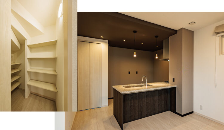 キッチンスペースの奥には階段下のスペースを活用して大型のパントリーを設置。食材やストック品をまとめて1ヶ所に収納しておけるので、キッチンを広く使えて毎日の家事をスムーズに行うことができます。