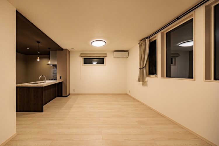 名古屋市北区のお家ではキッチンを壁に囲まれたスペースに配置することで、ダイニング・リビングとキッチンが使いやすくゾーニングされながら1つのLDK空間を構成する設計プランを採用しました。