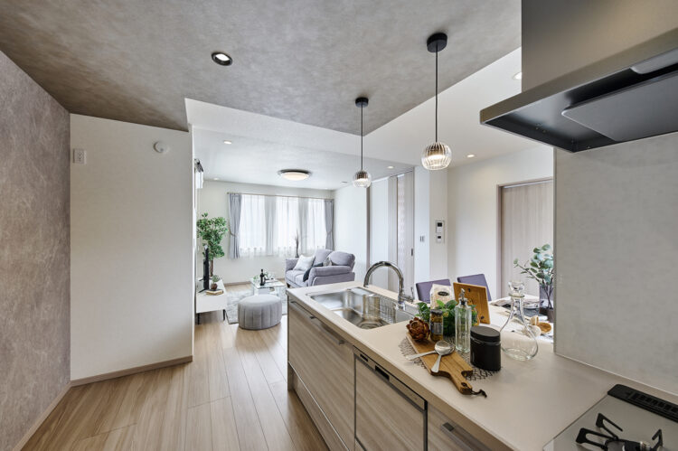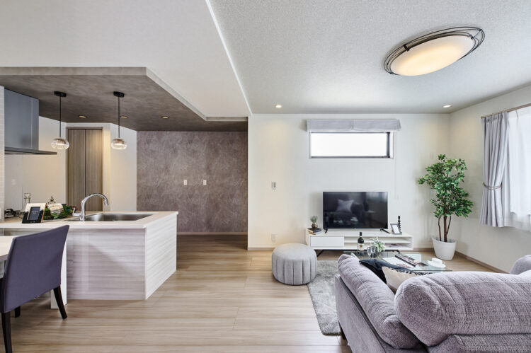 トレンドのグレージュカラーでまとめたLDKは、淡いトーンがより空間を広く見せてくれることで帖数以上の開放感が感じられます。