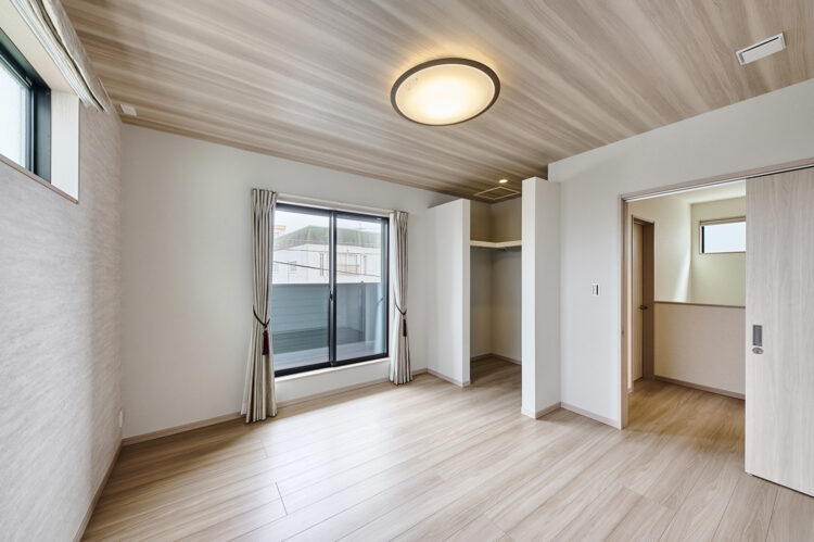 主寝室は9.0帖と広く、ドアレスのWICを設置することで衣類や荷物の収納はもちろん出し入れもスムーズ。