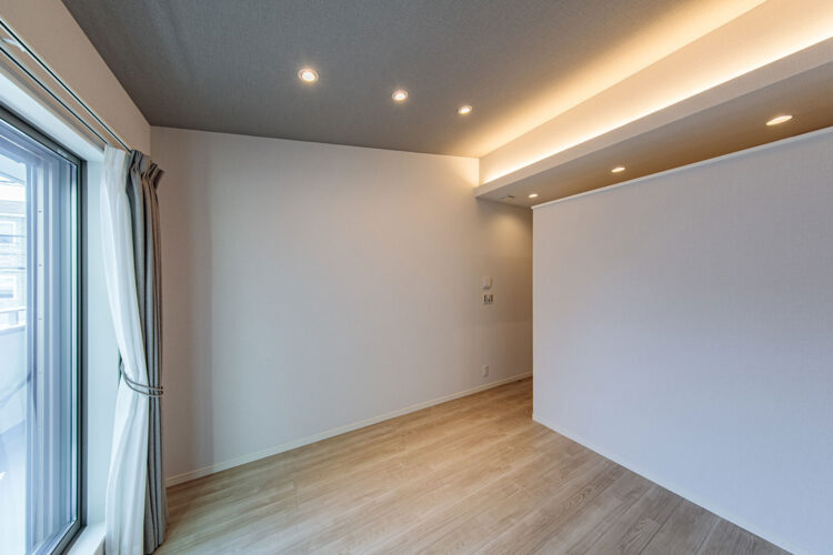 主寝室はライン状の間接照明でシャープな印象をプラス。