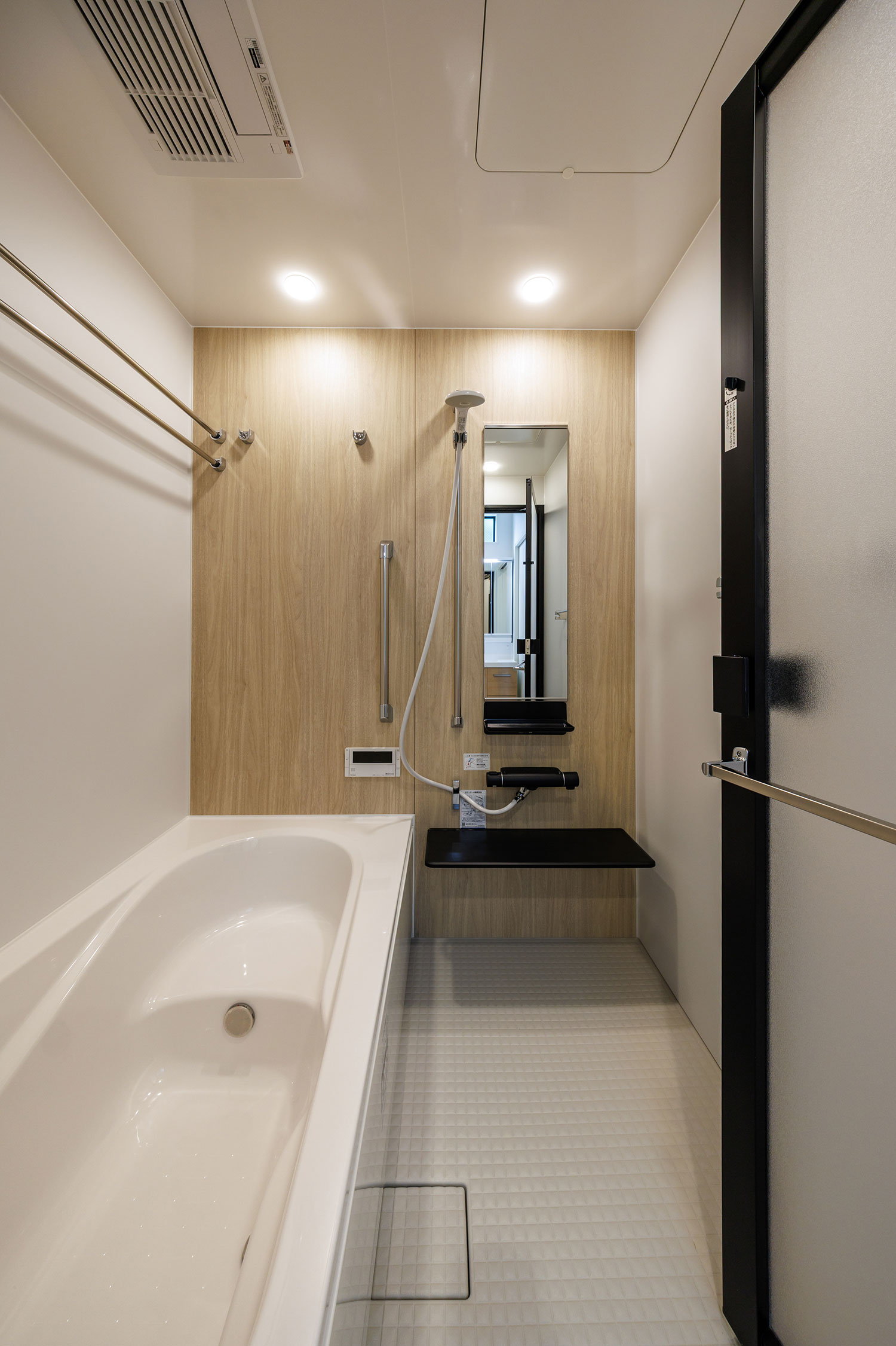 心地よい入浴を叶えてくれるサーモバスSの広々浴槽。独自構造で汚れがつきにくく、お掃除のストレスを軽減してくれる仕様。空気を含んだ大粒の水滴が心地よいスイッチ付エコアクアシャワーを装備。フルフォールスライドバーで手軽にオーバーヘッドシャワーの心地よさを味わえます。