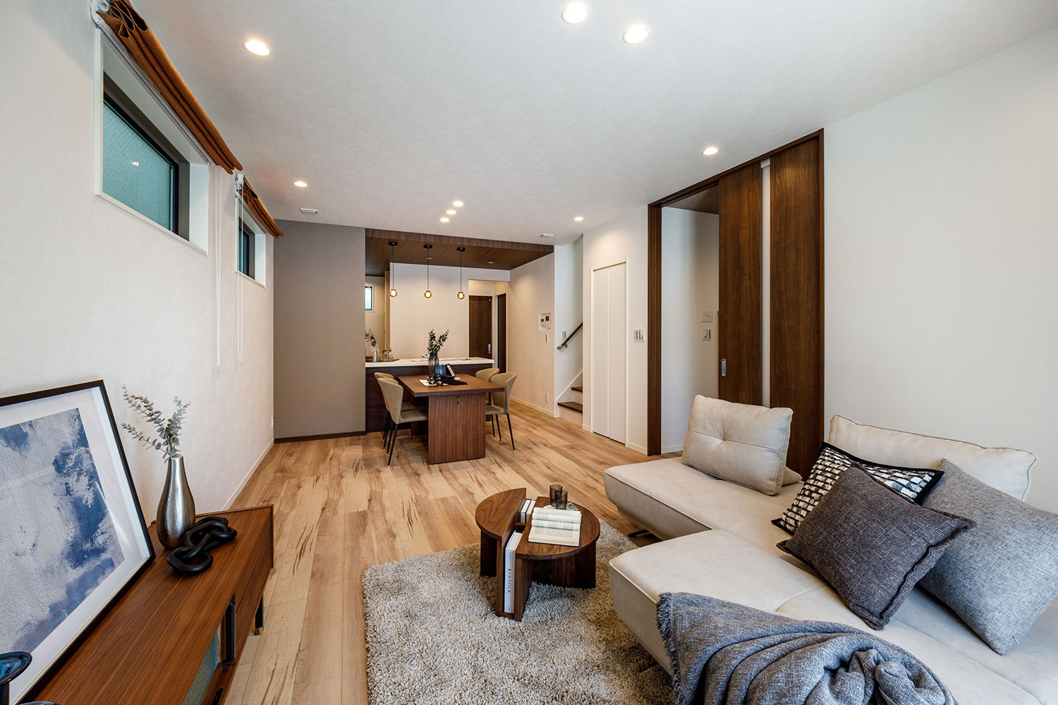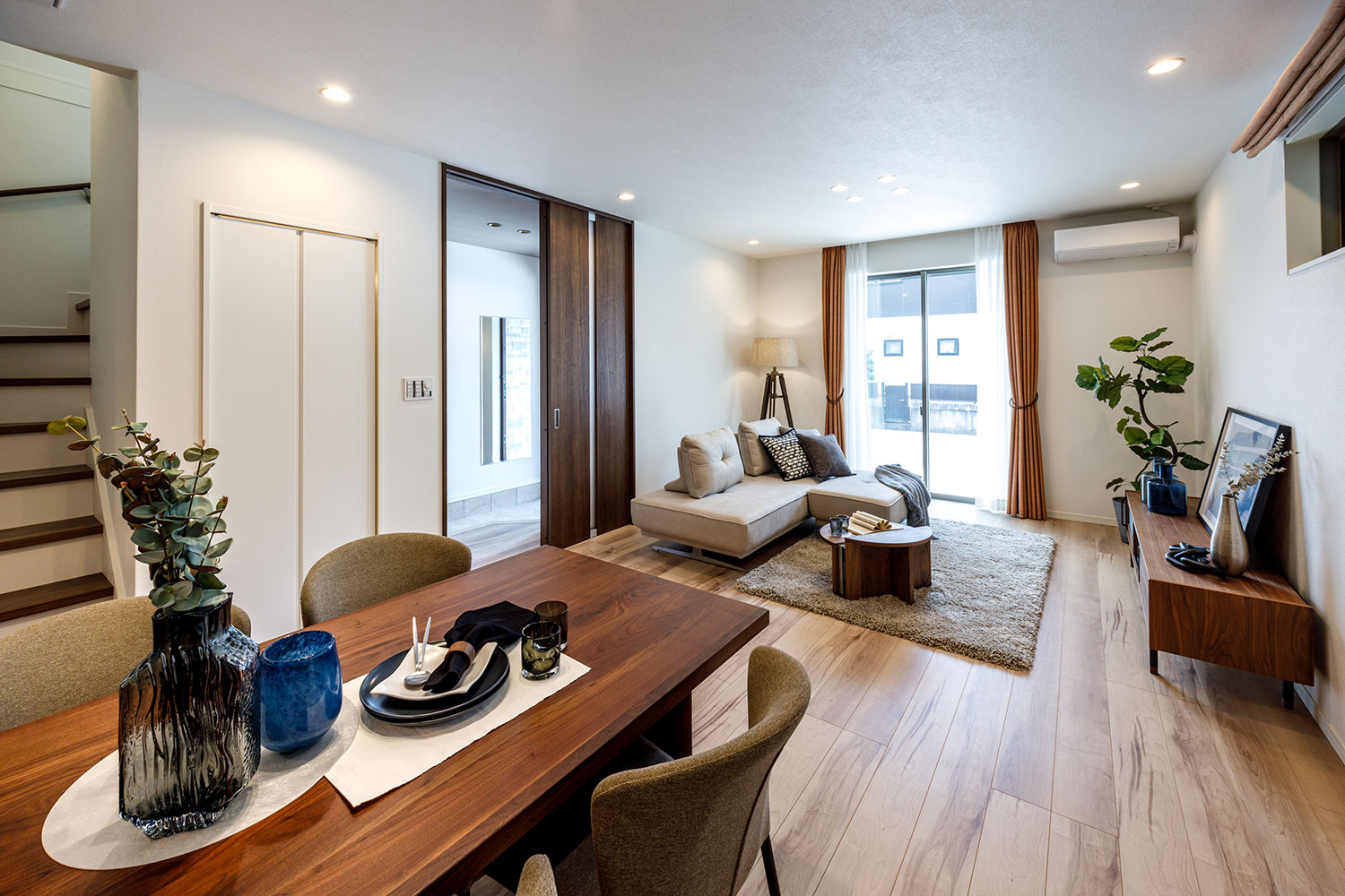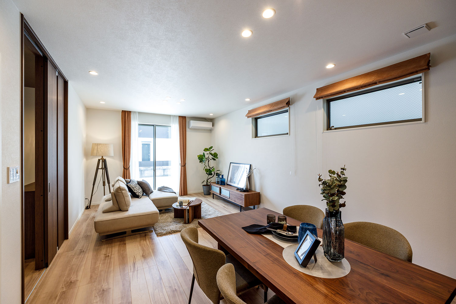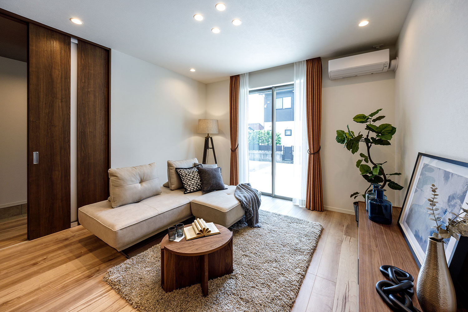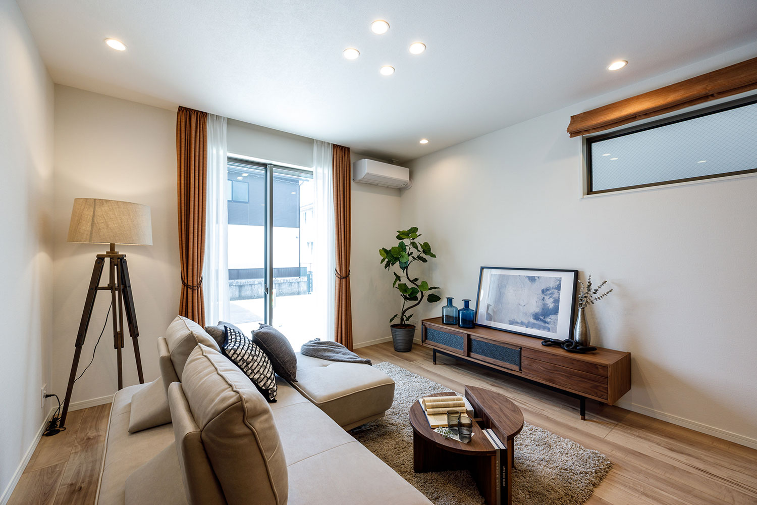 LDKエアコン1台、全室にサンゲツ製の機能性豊かで高品質なオーダーカーテン、全室LED照明を標準装備。快適な暮らしがご入居後すぐに実現します。