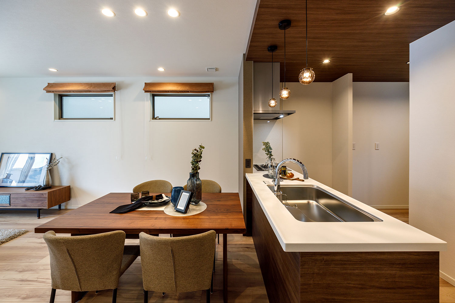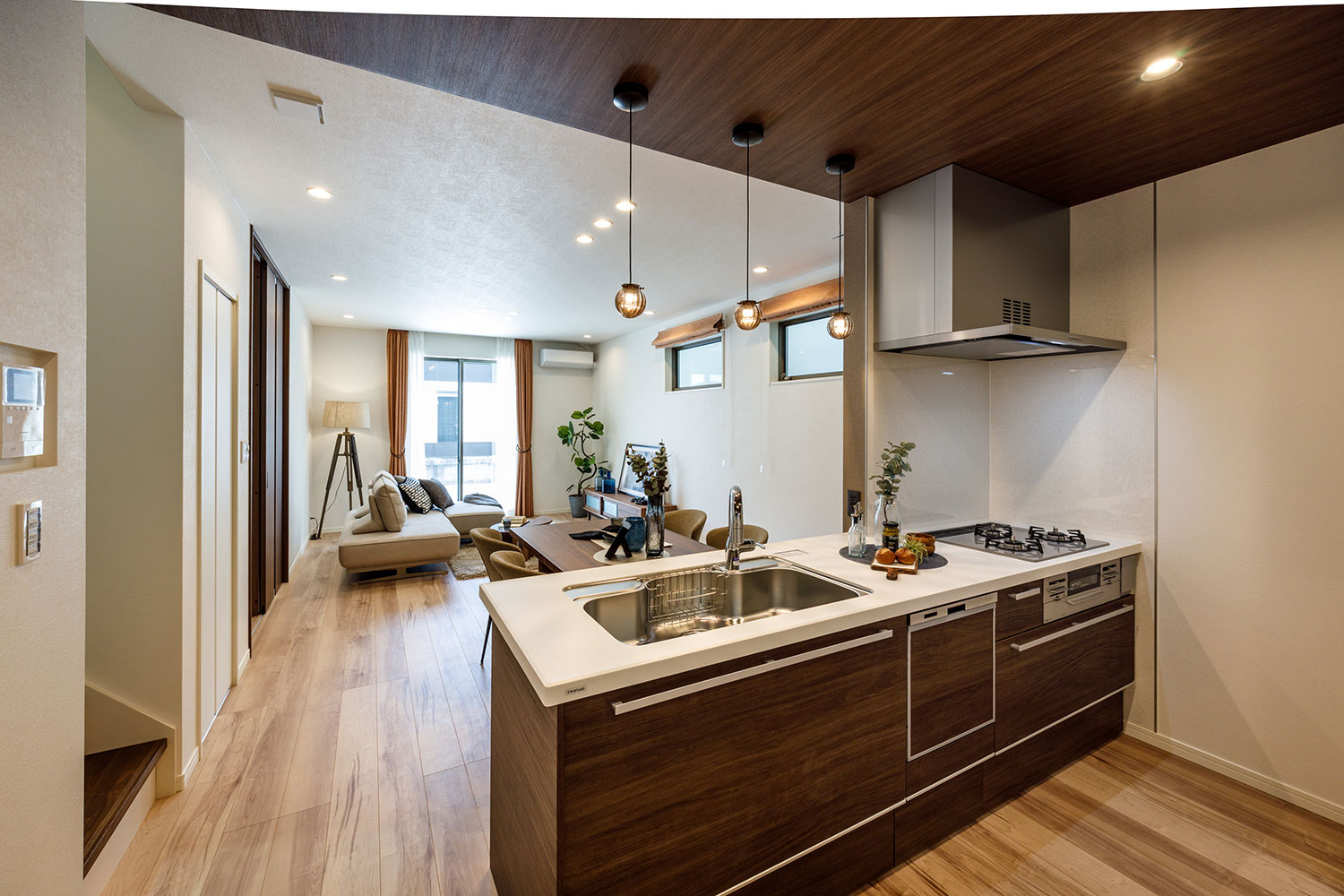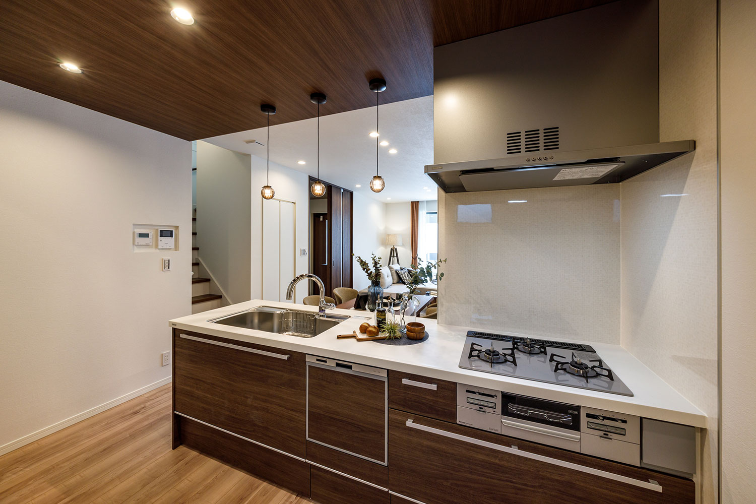 質感豊かな人造大理石のワークトップには静音シンクや浄水器を標準装備。鏡面仕上げのキッチンパネルはお掃除簡単!収納力と使い勝手を追求したサイレントキッチン。