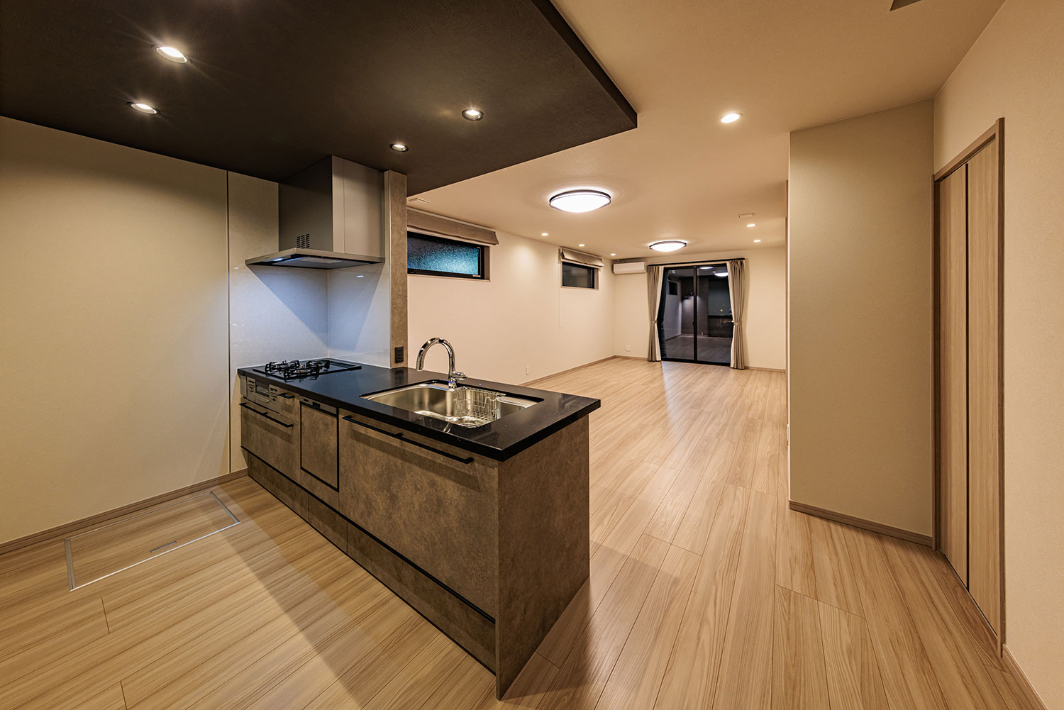 室内にはカーテンや照明、エアコンを設え、